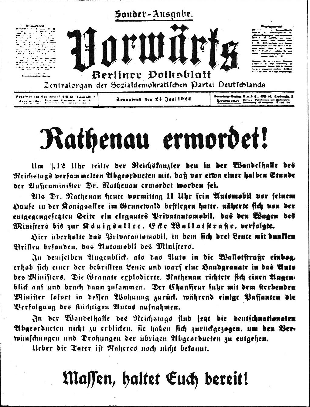 Dennoch konnte Rathenau noch am 16. April 1922 einen Erfolg als Aussenminister feiern, als er Deutschland mit Hilfe eines bilateralen Sondervertrags mit der Sowjetunion mehr Handlungsfreiheit verschaffte. Obwohl dieser Schritt auch von nationaler Seite begrüßt wurde, hatte die nationalistische und antisemitische Terrororganisation Consul zu diesem Zeitpunkt wahrscheinlich schon Mordpläne gegen Rathenau geschmiedet.